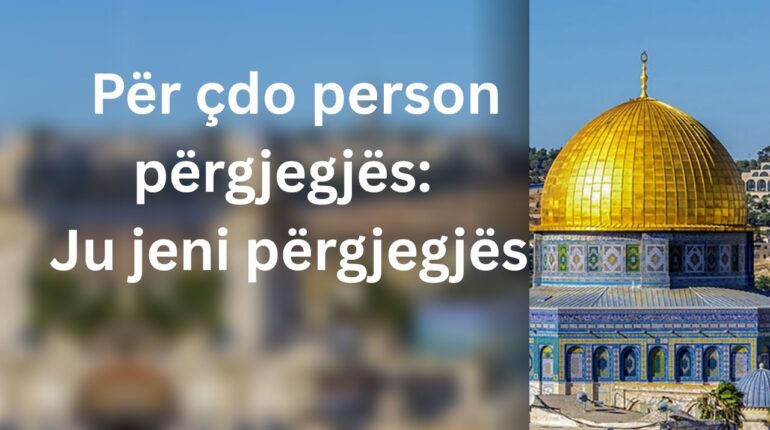 Hutbe e ditës së Xhuma nga Xhamia El Aksa 30-01-1447H 25-07-2025 D Shejh Muhamed Hysejn Tema Për çdo person përgjegjës: Ju jeni përgjegjës Vërtetë lavdërimi i takon Zotit. Atë e falënderojmë, prej Tij ndihmë dhe falje kërkojmë. Zotit i kërkojmë mbrojtje nga të këqijat e veteve tona dhe nga veprat tona të këqija. Atë që Lexo më shumë